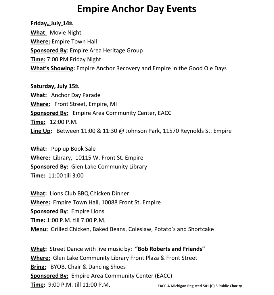 Day of celebration to commemorate the raising of the anchor from the depths of Lake Michigan in July of 1977. This anchor is currently located at the Empire Beach.