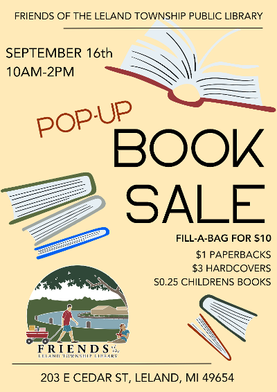 The Friends of the Leland Township Public Library is hosting a Pop-Up Book Sale on Saturday September 16, 2023, from 10:00 am to 2:00 pm at the Leland Township Public Library 203 Cedar Street in Leland MI. Come fill a bag for $10.00.