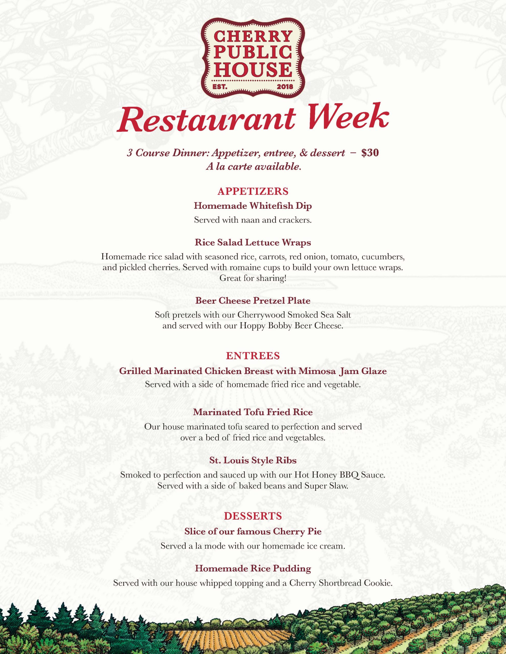 Reservations for dinner beginning at 5pm. Regular menu, Restaurant Week Menu and Drink Menu offered.