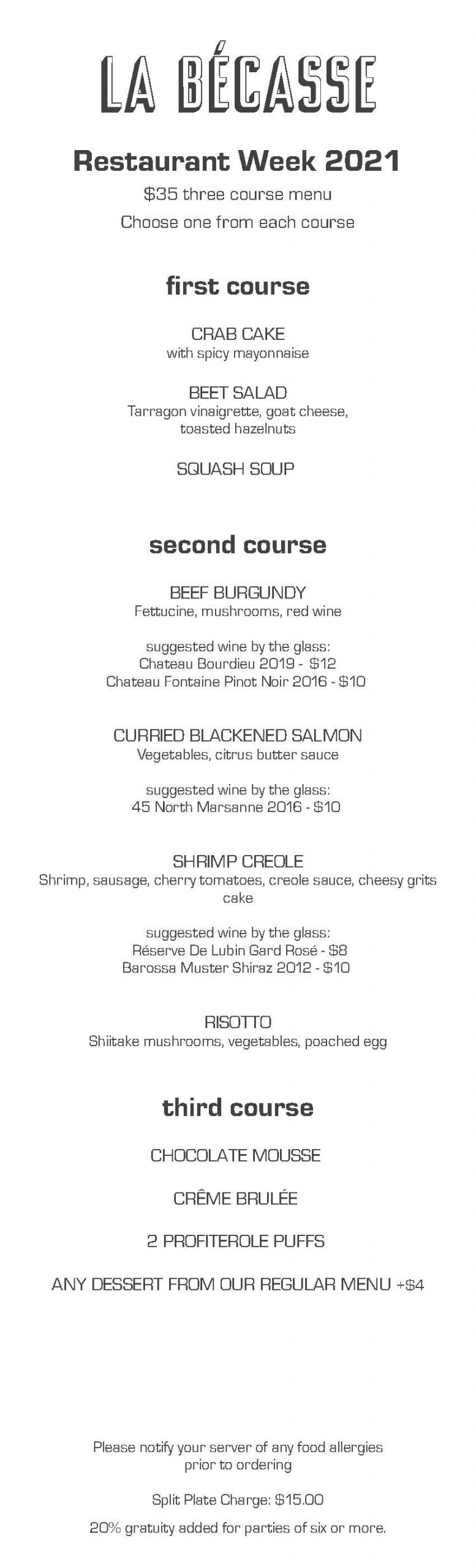 Regular menu, Restaurant Week Menu & Happy Hour all available to-go.