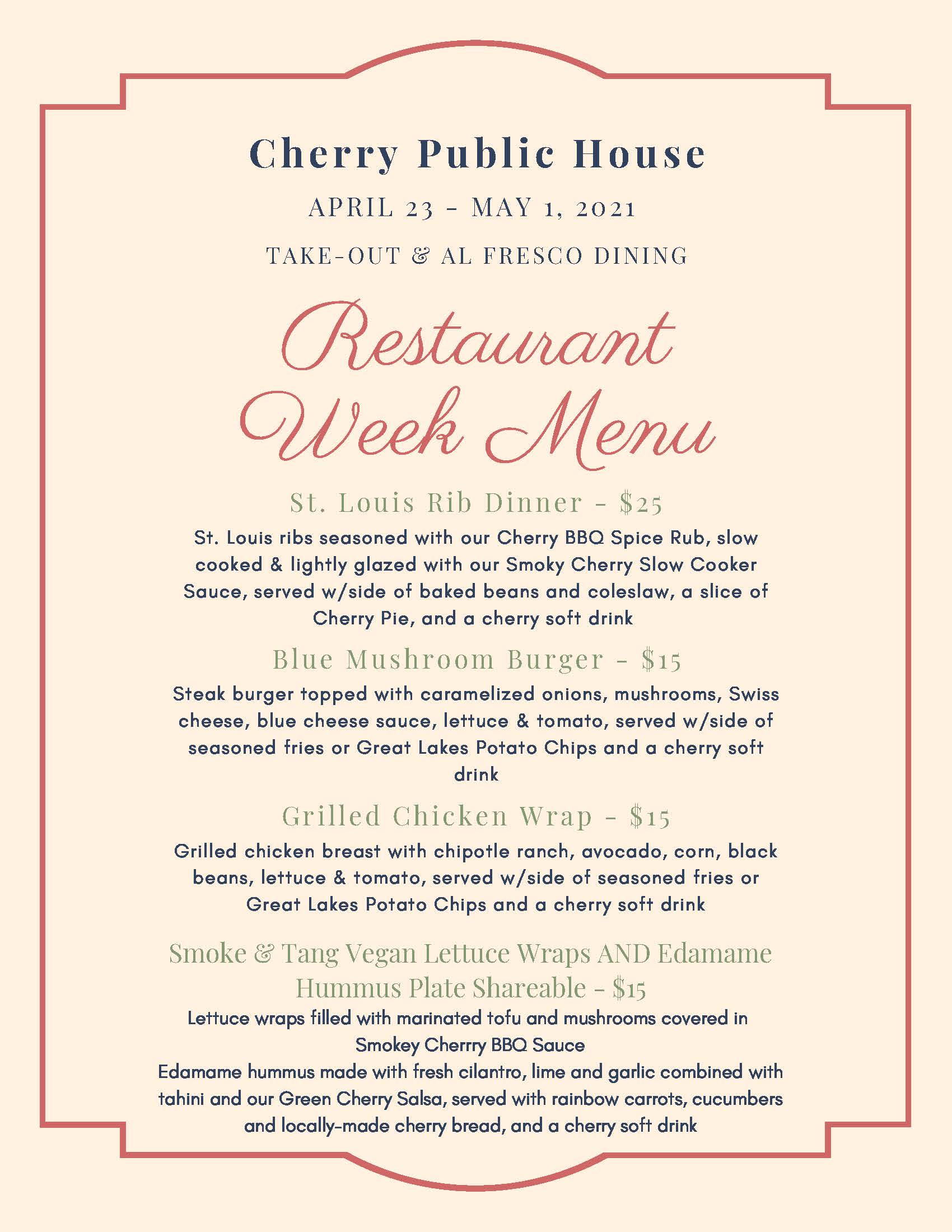 Restaurant Week Menu offered 4pm-close; Dine in or Take-out; Open 7 days a week.