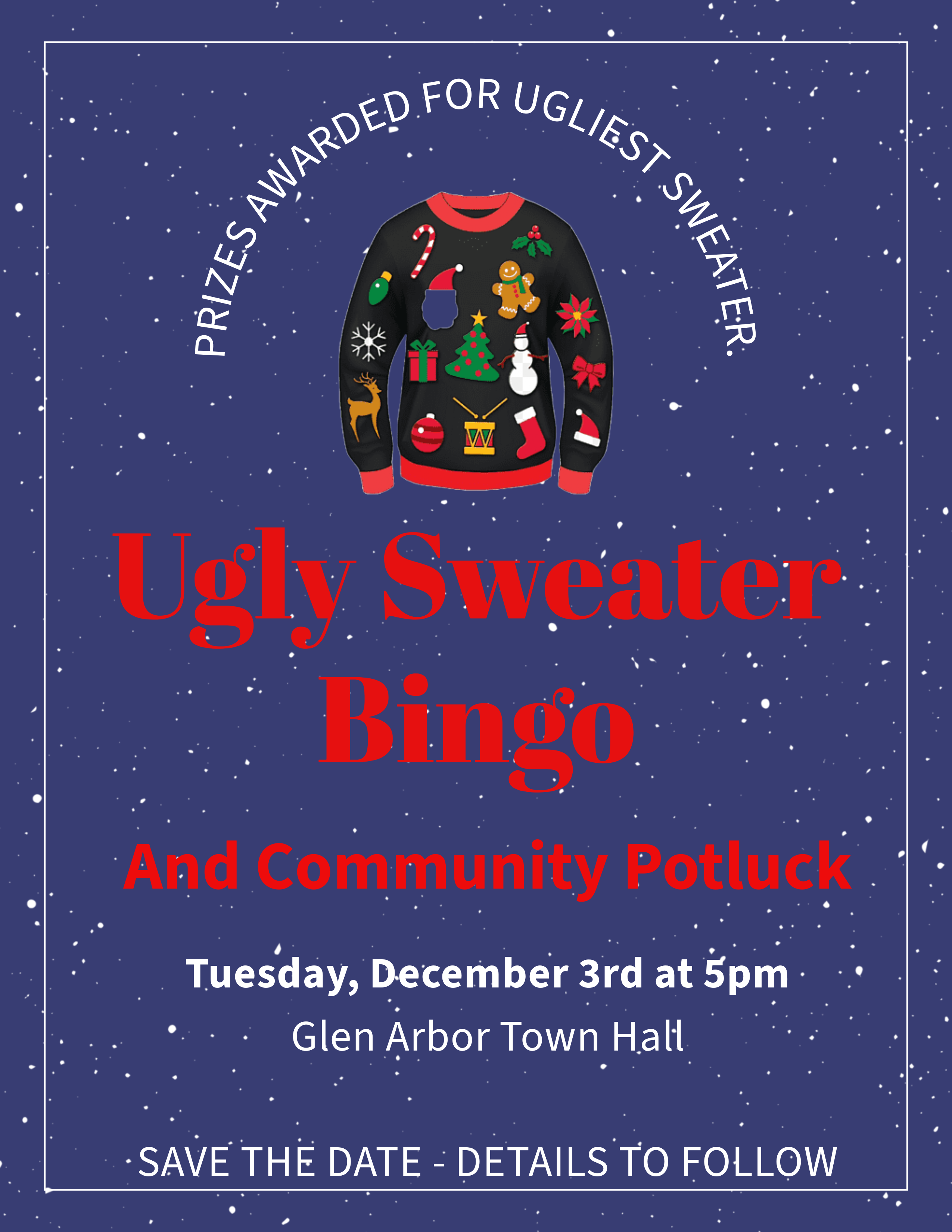 Bring a dish to share and BYOB. Wear your ugly Christmas sweater and play a round or two of Bingo. 5 pm – 8 pm on Tuesday, December 3 at Glen Arbor Town Hall.