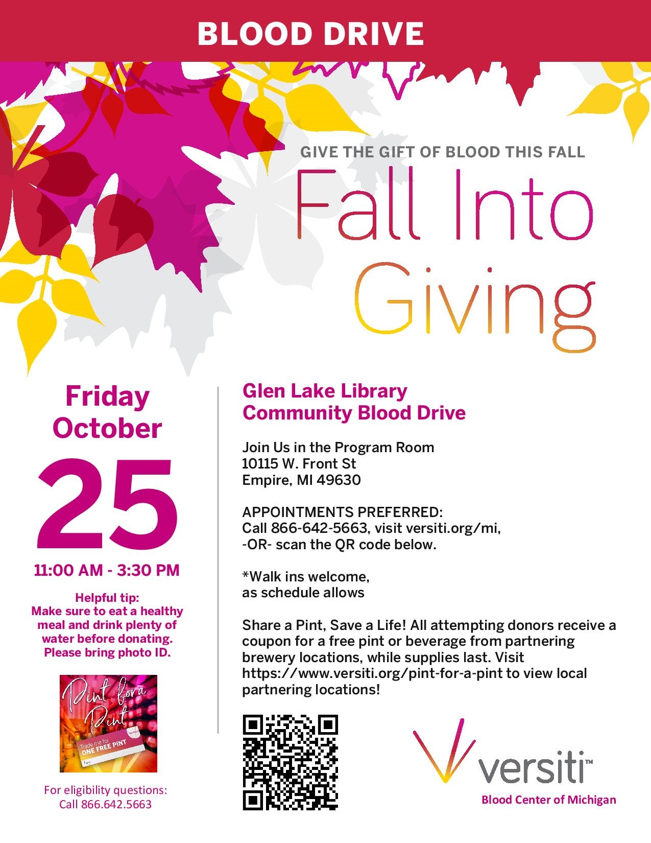 Help provide vital support to our regional healthcare system with your blood donation. The team from Versiti will be on hand from 11:00 am to 3:30 pm in our Program Room. Schedule an appointment to save a space. Walk-ins will also be welcome as the day’s schedule allows. Donors will receive a coupon for a free pint of beer, or other beverage, at selected Michigan breweries, including Stormcloud and Shorts!