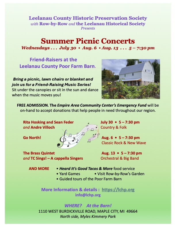 Who: The Leelanau County Historic Preservation Society with co-sponsors including the Leelanau Historical Society & Museum, Row-by-Row <row-by-row.org>, and the Empire Area Community Center. Why: To make new friends who support the rehabilitation and public use of the old Leelanau County Poor Farm Barn. Help us put this Historic Community Treasure to good use! Where: At the Poor Barn Farm!