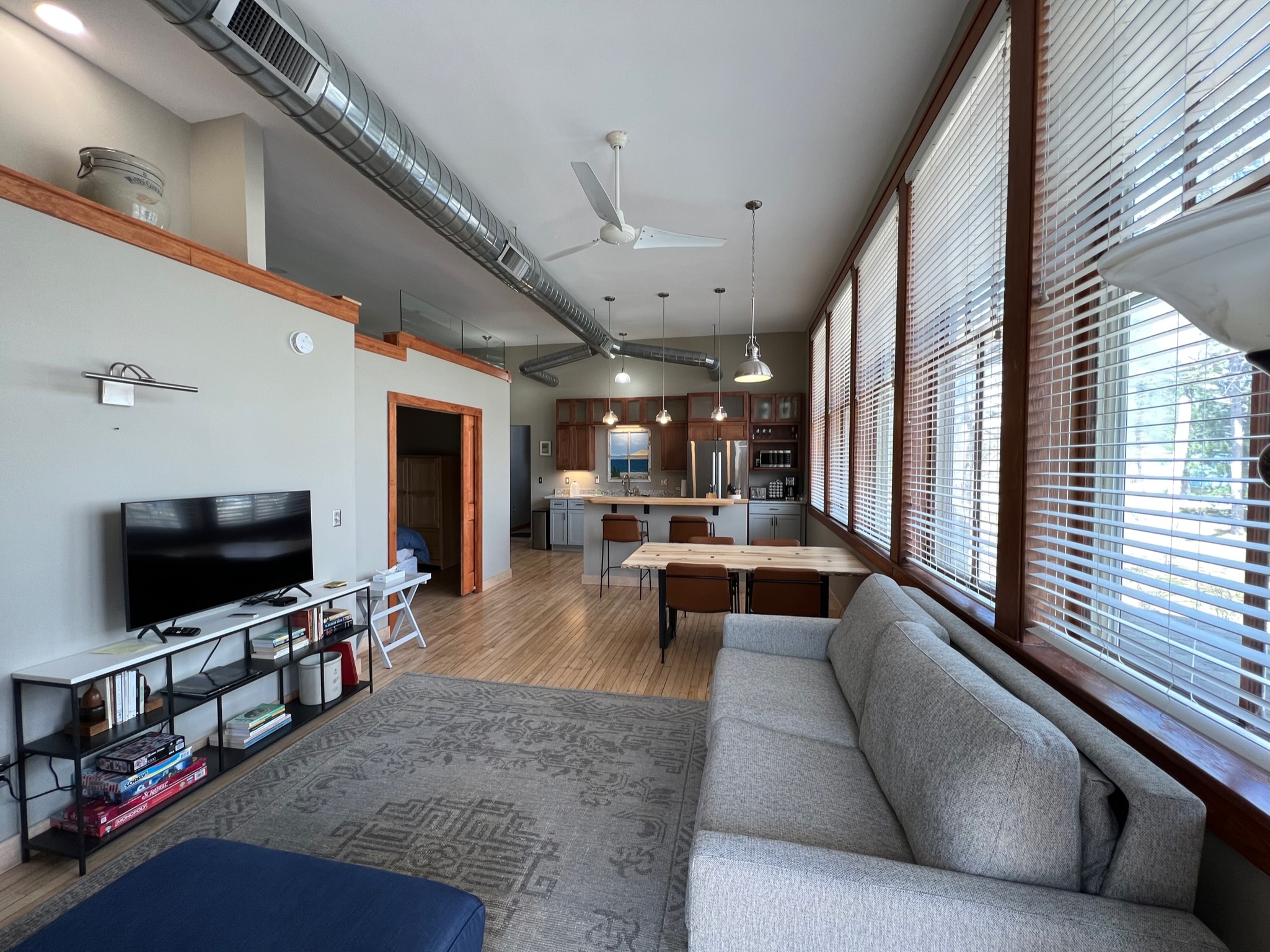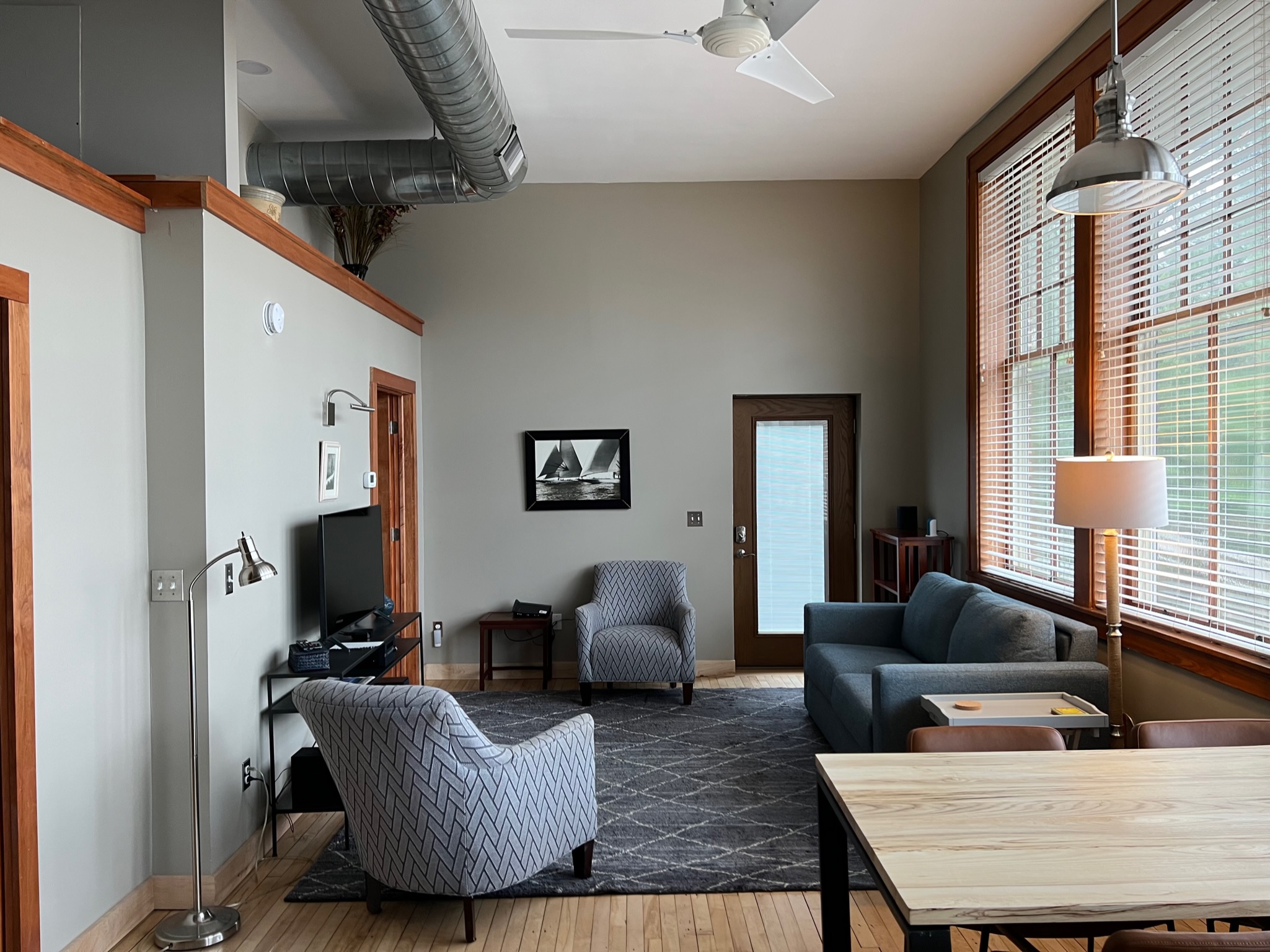 Arbor School Lofts offer spacious and comfortable accommodations for guests in the heart of Glen Arbor. The building has two nearly identical units, East (The Owl) and West (The Acorn). With fresh furnishings, newly restored woodwork, new appliances, 12-foot ceilings and abundant natural light, each apartment offers a relaxing atmosphere for 1-6 people. Guests can enjoy the convenience of a well-equipped kitchen, stacked laundry facilities, and sleeping quarters with two private bedrooms. Additional sleeping is provided by a queen-size sleeper sofa in the living area or a loft with two single beds looking over the living area. Glen Arbor Lofts is convenient for exploring Glen Arbor’s shops and restaurants, Lake Michigan beaches, and the Crystal River recreation area, with easy access to the Sleeping Bear Heritage Trail.