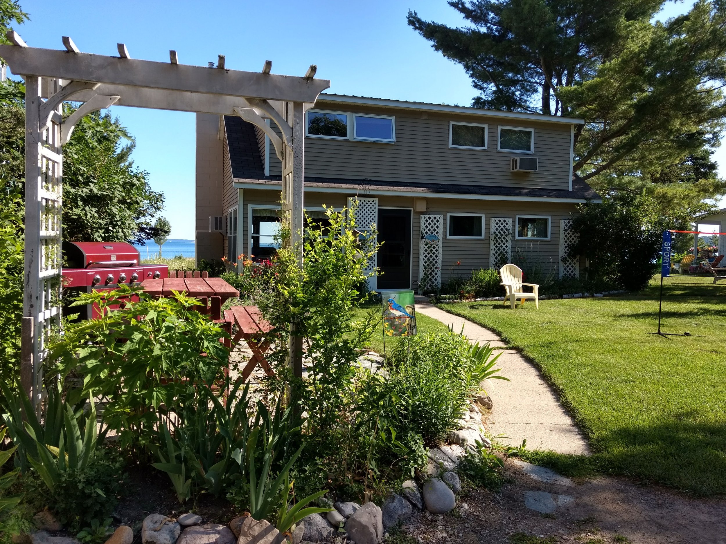 Nestled below Glen Arbor’s Alligator Hill, facing Lake Michigan’s Manitou Islands and Sleeping Bear Bay, Beachside Garden Cottage is not a condo, not a cabin, and not a guest house. It’s a two story home, 3 BR, 2 BA, surrounded by flowers, complete with a screened-in porch facing Lake Michigan, an attached lakeside deck and a lovely lawn in back. Its rustic knotty pine kitchen and living room interiors, the painted wood floors upstairs and the screened-in porch give it the look and feel of an old-fashioned beachfront cottage, yet it has been updated to fit today’s uses.