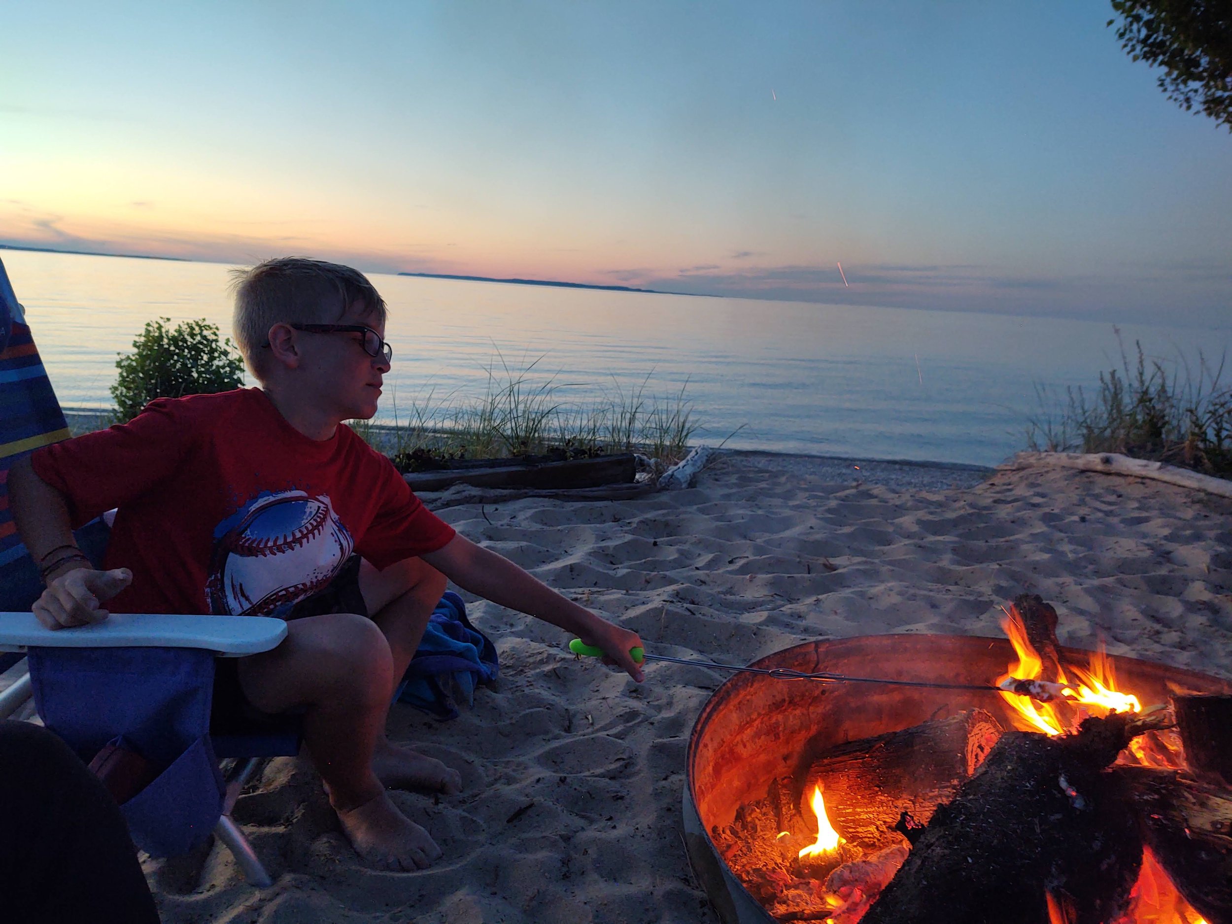Dead center on Sleeping Bear Bay beach, looking directly out on Lake Michigan with views of the Manitou Islands. The sandy beach lies 150 feet in front, just down the boardwalk and a slight rise; there are no steps to the shoreline, no road between the cottage and the water. Our driveway approach from M-109 is through the wonderful northwoods. Off of M-109, between Glen Arbor and Glen Haven in Leelanau County, Michigan. One mile to Glen Arbor. Walking distance. 500 feet through a path in the woods to the Heritage Trail.