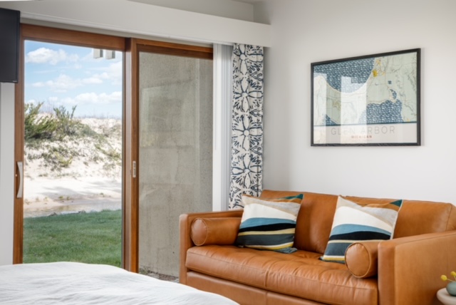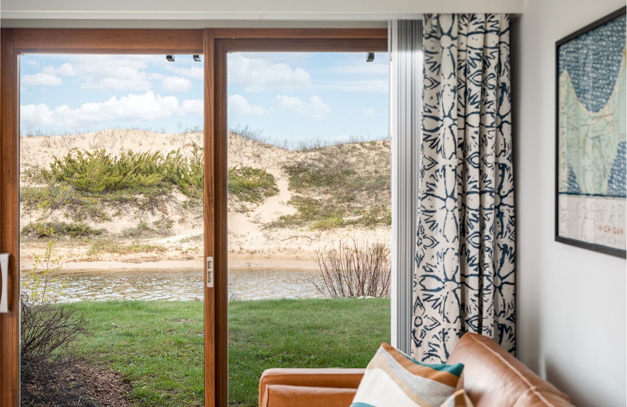 An ideal Glen Arbor getaway, A Cool Studio, is a plush condo on the banks of the Crystal River, overlooking pristine sand dunes and a private Sleeping Bear Bay Beachfront on the majestic Lake Michigan Shores. This Homestead Resort Studio is a juxtaposition of vintage and modern, including character-filled parquet floors, and mid-century modern hardware, while featuring all new plush bedding, fully updated swanky furniture, West Elm outfitted kitchenette and all the latest electronics to keep up…or just relax and enjoy the waterfront!