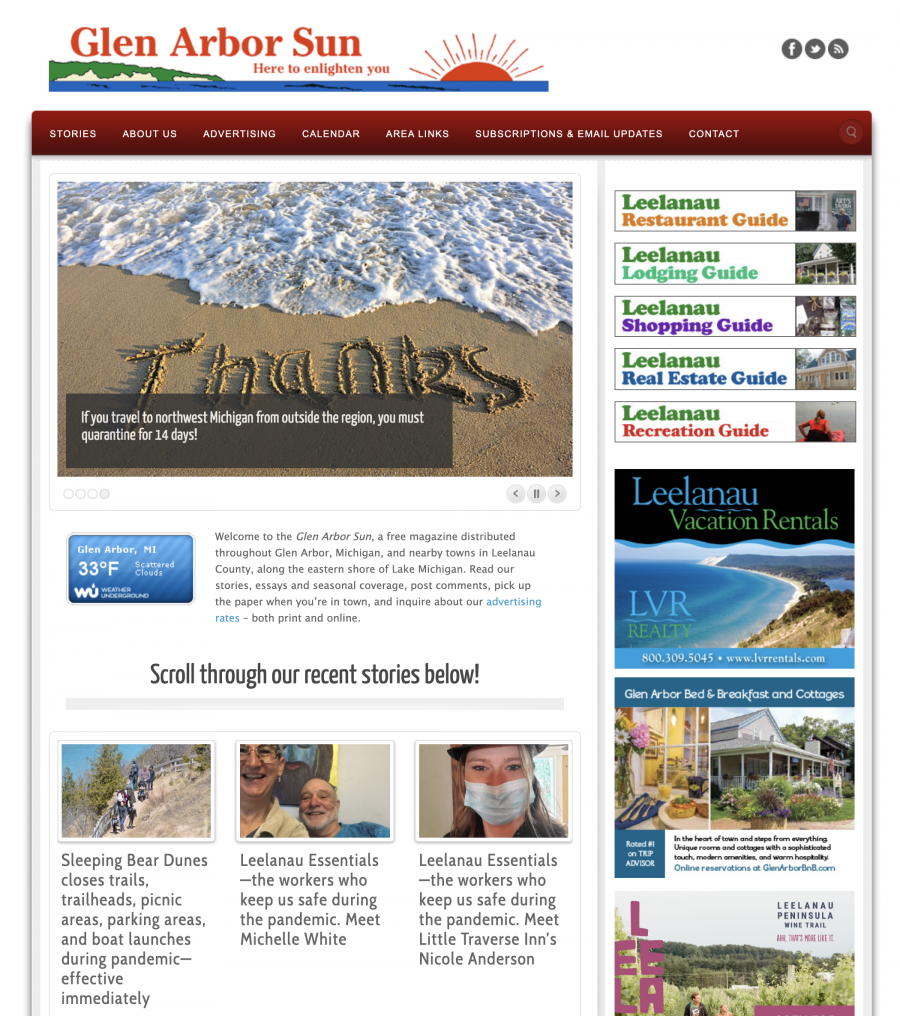 The Glen Arbor Sun is a free newsprint magazine published every other week during the summer and once a month during the fall, winter and spring. The newspaper is distributed at businesses throughout Leelanau County. Please contact editor Jacob Wheeler with inquiries about advertising, contributing, or pitching stories.