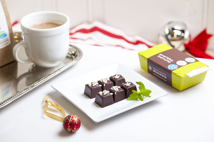 We strive to minimize our impact on the natural environment. Our chocolates are all-natural and contain many organic and other naturally grown ingredients. We package the chocolates in compostable bags and recyclable/recycled materials when possible.