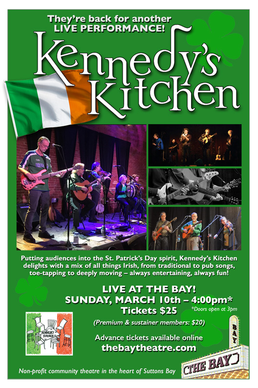 Bay Theatre The Bay Theatre 214 St. Joseph, Suttons Bay, MI 49682, Suttons Bay, MI, United StatesKennedy's Kitchen is a talented group that has been making Irish music together and performing at backyard parties, weddings, pubs, concert halls, and national festivals since 1998. They have averaged about 80 shows per year and traveled as far as New York and Naples, Florida, recording six CDs along the way. The lineup is all