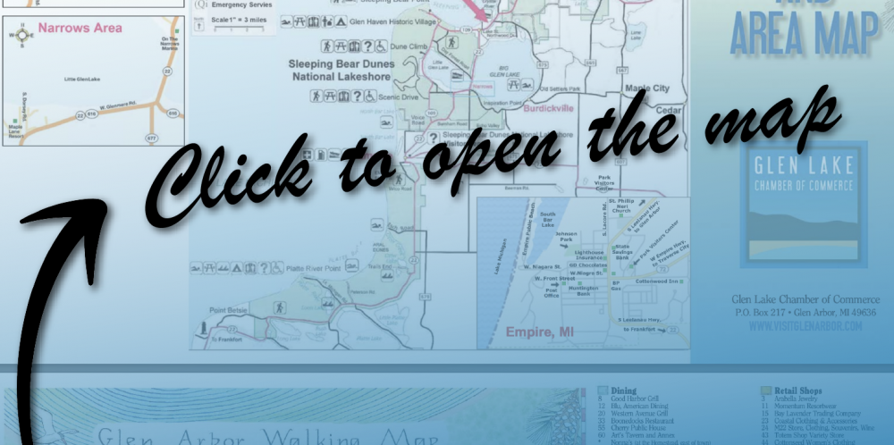 Walking Map View the most recent version of the Glen Lake Chamber's Walking Map, including Glen Arbor proper, Burdickville, the Narrows, and Empire. Explore more Local Event Calendar Browse the Business Directory Find Places to Stay Discover Things to Do Trails & Scenic Overlooks Beaches & Boating